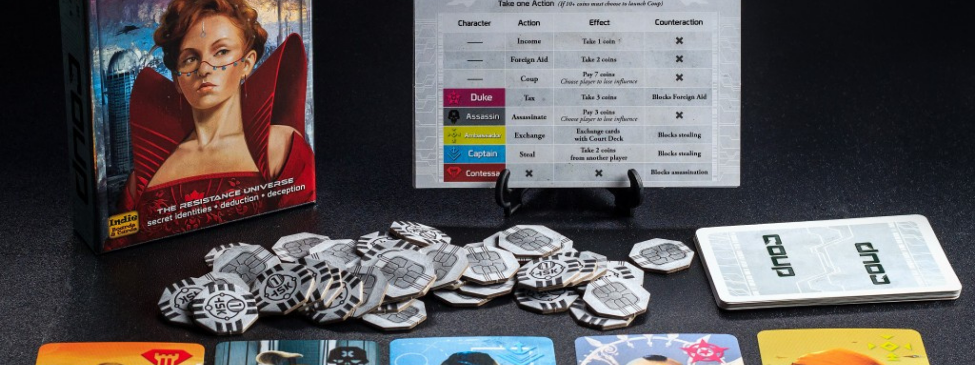 If you’ve ever wanted to test how artfully you send assassin’s after your friend while talking cordially across the table to them, Coup is the hidden role game you need to try. Based in subterfuge and bluffing, player’s act as the head of a family, trying to survive in a sci-fi city-state run by a weak and corrupt court. To do so, you are given influence - two cards played face down in front of you, which are equipped with unique roles. There are Dukes and Assassins, Ambassador’s and Contessa’s, each with skills to gain either coins or insight into the abilities of your fellow family head’s. Whoever reaches 10 coins first can launch a coup against another player, taking away one of their two precious influence cards - and whoever survives till the end is the victor. Will you play weak until you strike a decisive blow against a competing family, or will you enter court as an investigator, accusing other players of subterfuge at every turn?