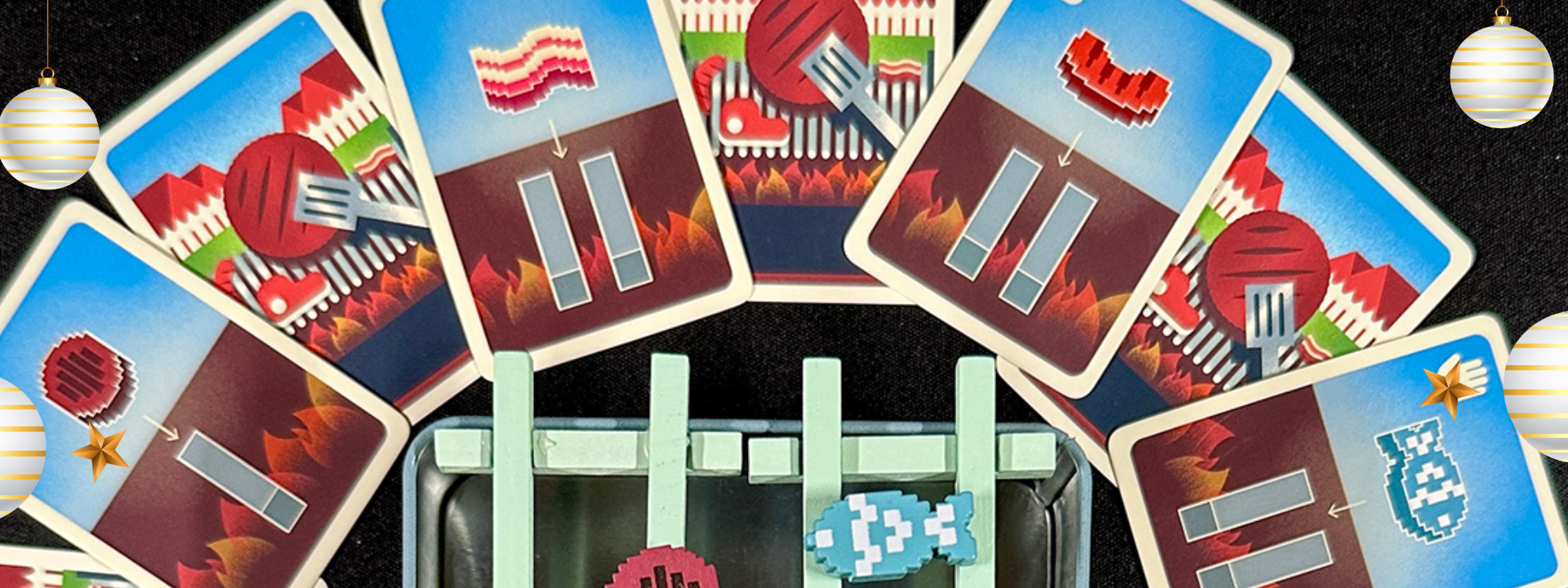 Cute dexterity game which fits neatly in a little themed tin, Barbecubes has you drawing cards with pieces of food on them, and trying to place these items on the grill - but watch out! If you spill on the grill it's game over! The tiny pieces of food are so cute, as are your miniature tweezer-tongs for flipping, and the cleverness of using the box as the grill.