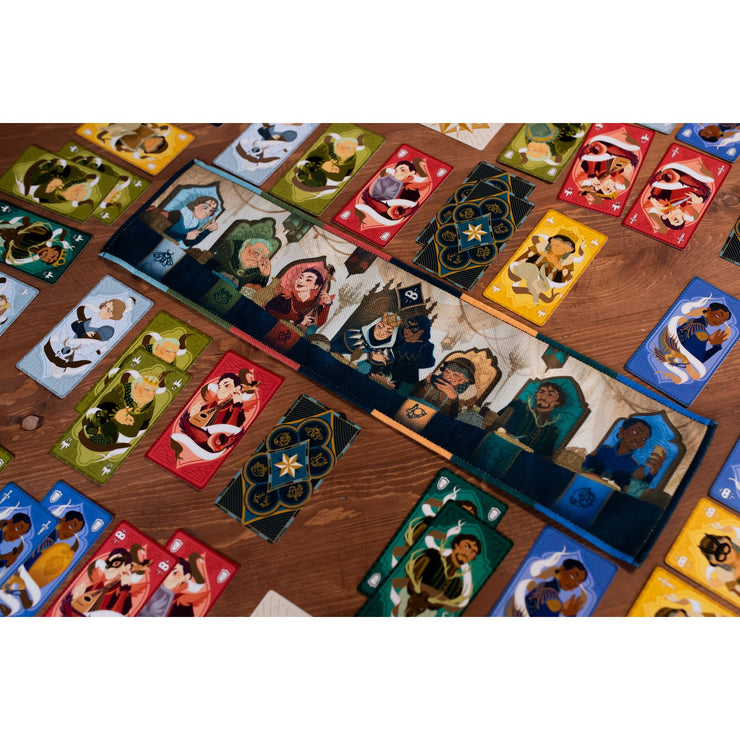 There are 6 different families consisting of 15 Courtier cards each. On your turn you’ll draw 3 cards, then play 1 to the Queen’s Table, 1 in your Domain, and the last in an opponent’s Domain. At the Queen’s table, cards can be played either above or below the column of the matching family. At the end of the game, the families with more cards above than below will be Esteemed. Those with more cards below the mat than above will be Disgraced. The cards in each players’ domain will be scored based on whether their families are Esteemed (+1) or Disgraced (-1).