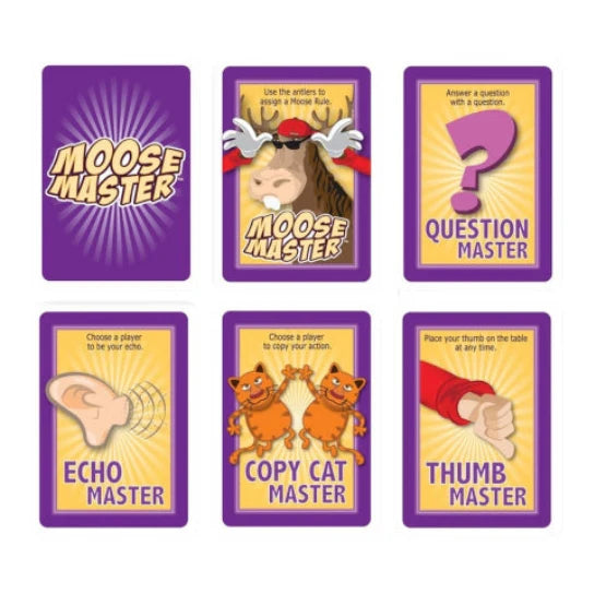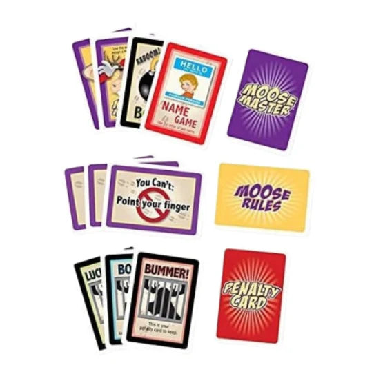 Moose Master sets up in seconds, is easy to learn and fun for everyone. Start the game by choosing 2 Moose Rules that everyone must follow. (Ex: You can*t say the word *no* and you can*t refer to anyone by their first name.)