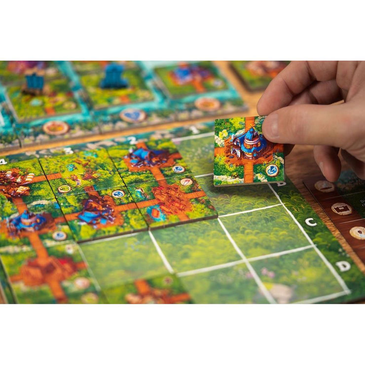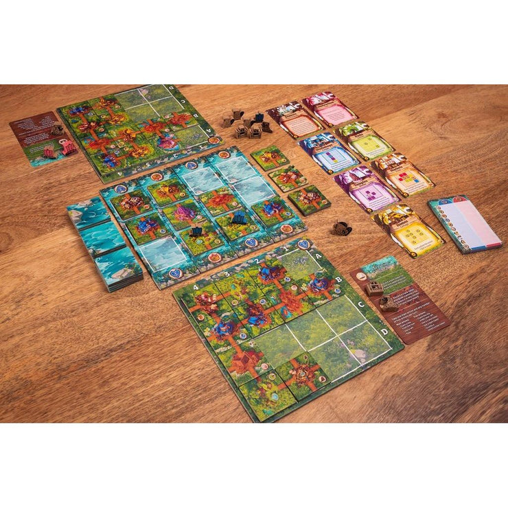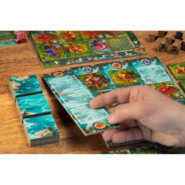 Timber Town is a 2 player "river drafting" game where players grab tiles from an ever changing board. Players place their tiles in their towns into the same column from which the tile was drafted from in an effort to match the objectives for that game.