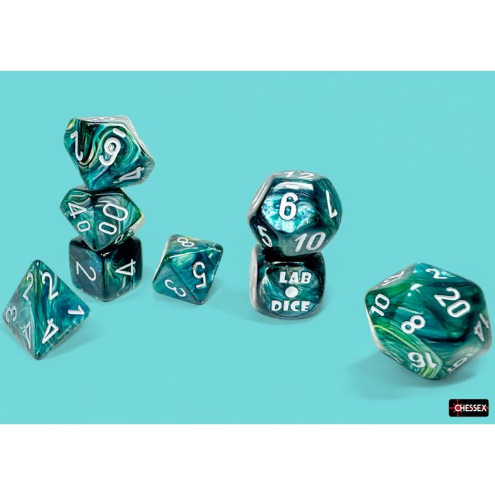 This set contains 8 Lustrous® Neptune™ dice with grey numbers with the following shapes: