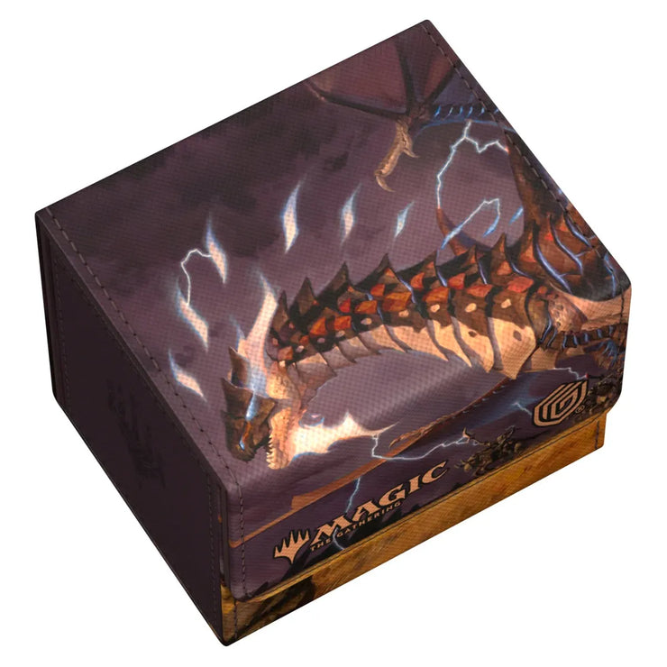 The Sidewinder 100+ made from durable Xenoskin material holds up to 100 double-sleeved or 120 single-sleeved cards, which are kept secure in the deck box thanks to a strong magnetic closure and soft microfiber interior. The sturdy, high-quality Xenoskin surface of the Sidewinder is printed in full color with officially licensed artwork from Magic: The Gathering’s Tarkir: Dragonstorm set.