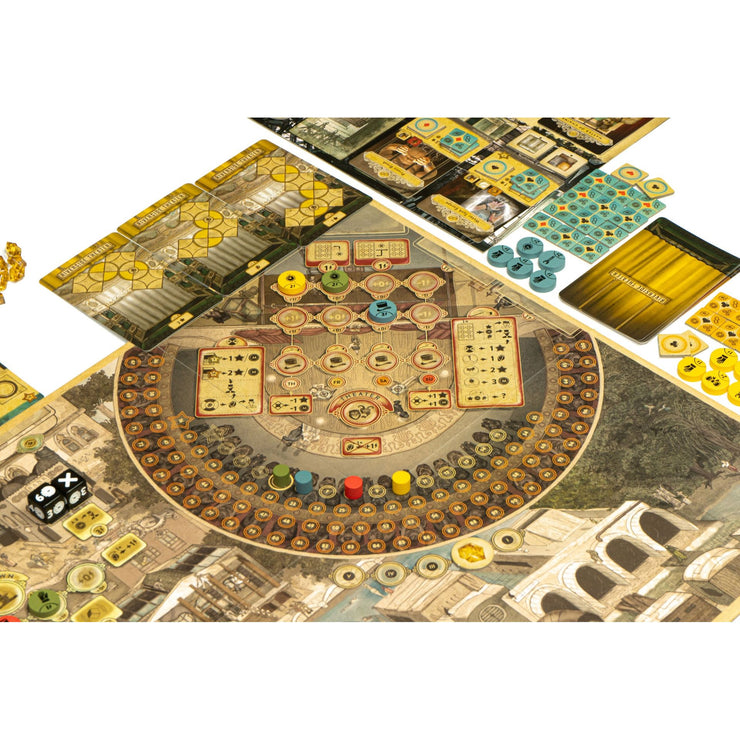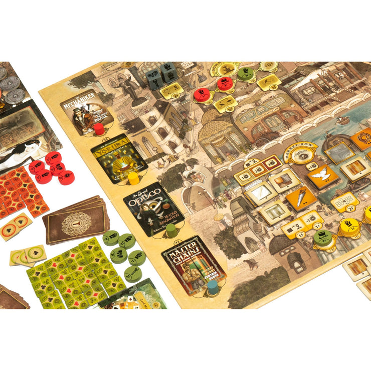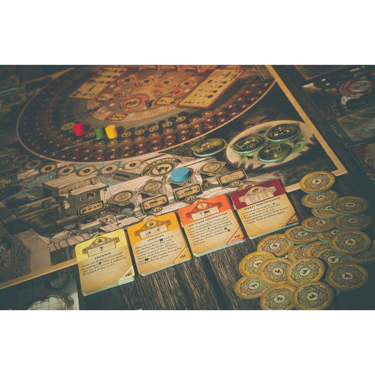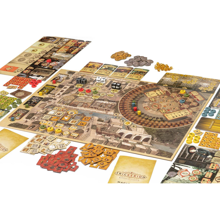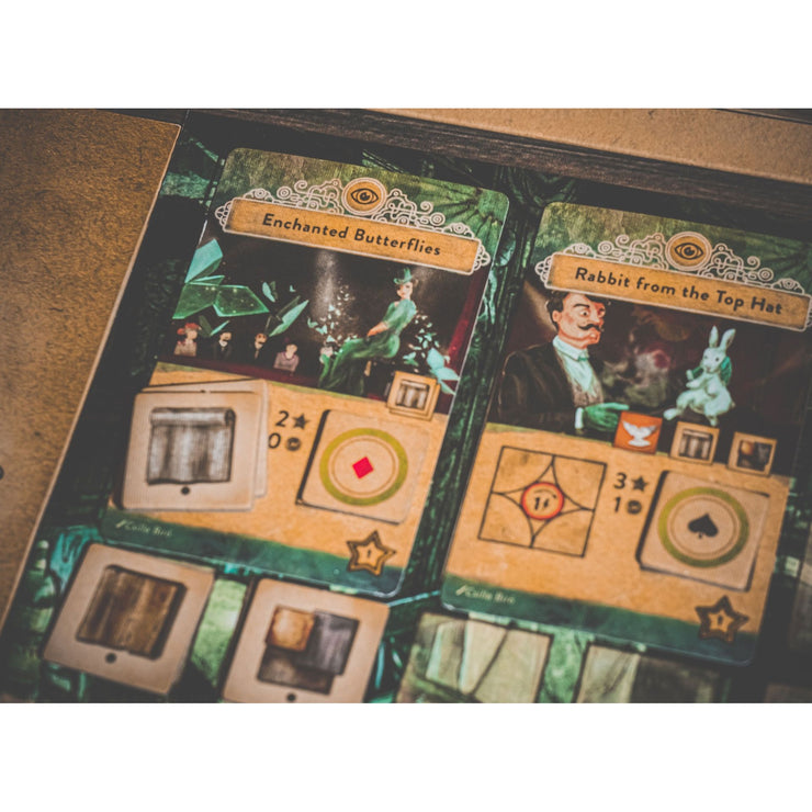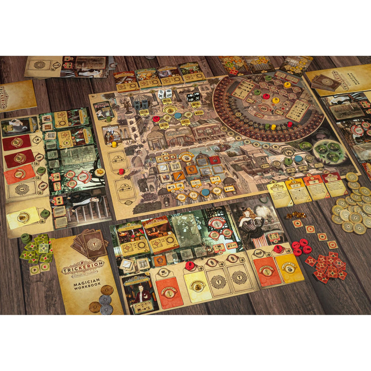 In Trickerion, players are rival stage illusionists facing off in a grand competition for fame and fortune. They will assemble a team of apprentices and specialists, learn intricate magic tricks, acquire necessary trick components, and schedule their tricks in the Theater to create breathtaking performances at the end of each week, represented by one game round.