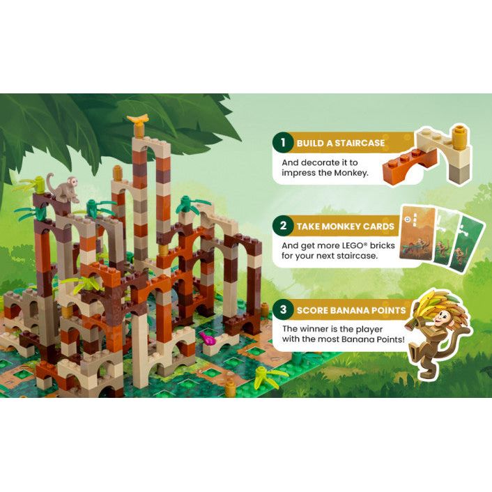Players must strategically work together to construct the Monkey Palace while competing for the highest brick income and points, all under the watchful gaze of the Monkey. The palace gradually takes form thanks to a construction using LEGO elements, and each time the board game is played, the building experience and final construction are unique.