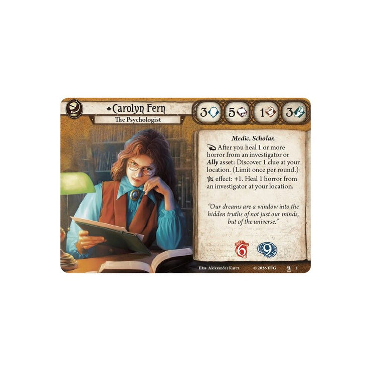 As the enigmatic secrets of the Mythos begin to unfold, it takes a keen mind like Carolyn Fern’s to help piece everything together. With her intellect and deep understanding of the human mind, Carolyn can heal horror from her fellow investigators while cracking mysteries of the unknown. This Investigator Deck for Arkham Horror: The Card Game comes with a pre-built, ready-to-play Seeker deck, allowing you to jump into a campaign from the moment you open the box. Also included are additional cards for upgrading the deck during a campaign.