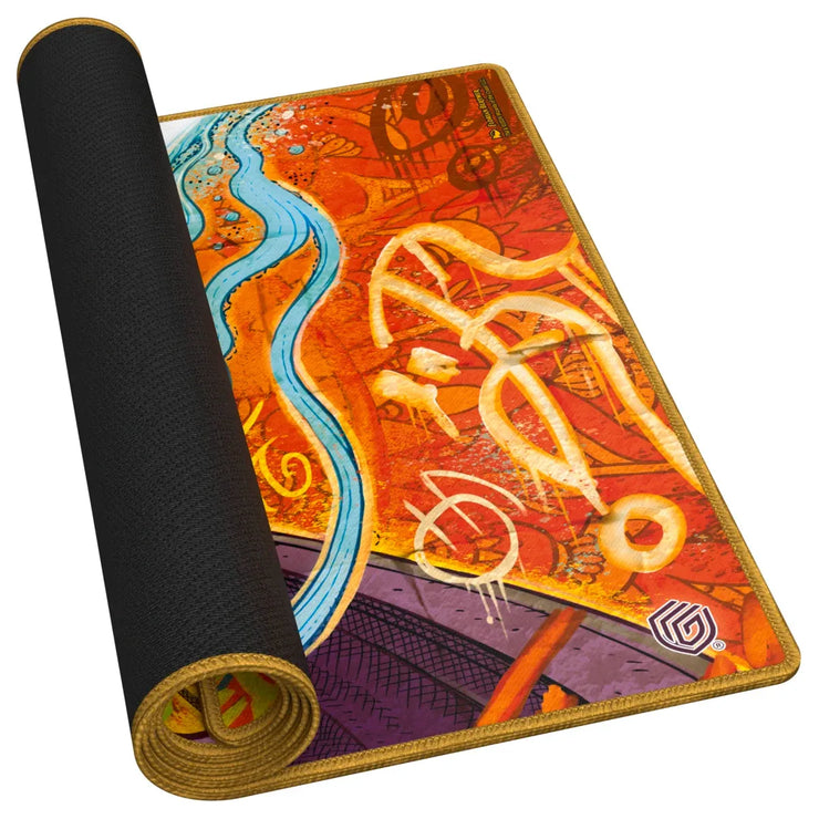 The Play-Mat in the standard size 61x35cm shows officially licensed artworks from Magic: The Gathering's set Aetherdrift. The soft cushioned Play-Mat with non-slip underside improves the gaming experience, protects gaming cards and accessories, and is even more durable than classic Play-Mats thanks to its stitched edges.