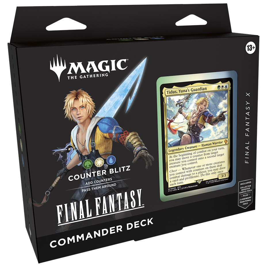 In Commander, four players come together to show their strength and strategy, with one player coming out on top. Each 100-card ready-to-play Magic: The Gathering®—FINAL FANTASY Commander Deck makes it easy for Commander fans in your store to grab a deck and play right away.