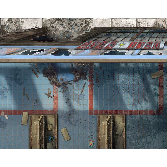 - 8 highly detailed, poster-sized battlemaps (558mm x 432mm, 135gsm), scaled to your 32mm miniatures. Locations included: Red Rocket service station, Drumlin Diner, Abandoned Shop Fronts, Roadside Farms, Railway Station, Military Checkpoint, Warehouse, and Garage.