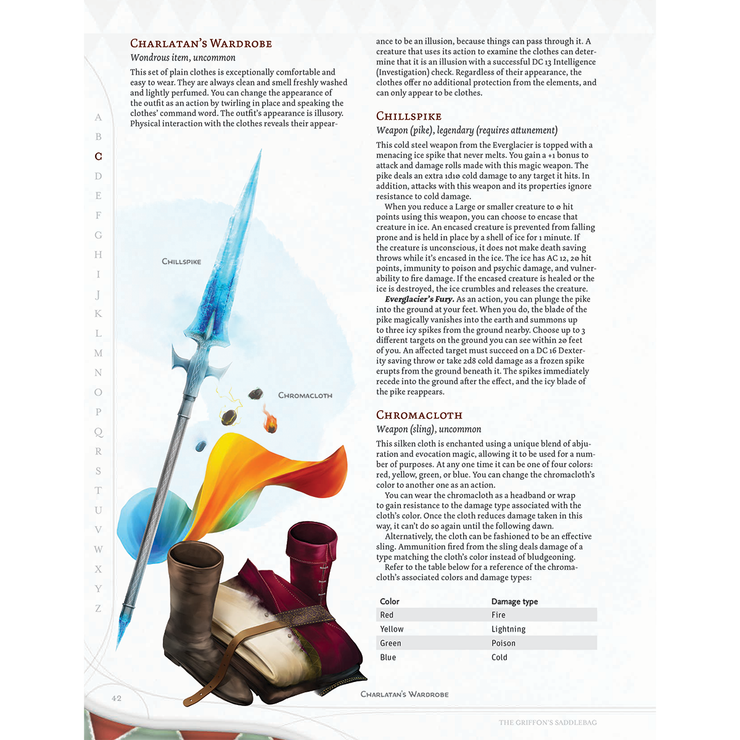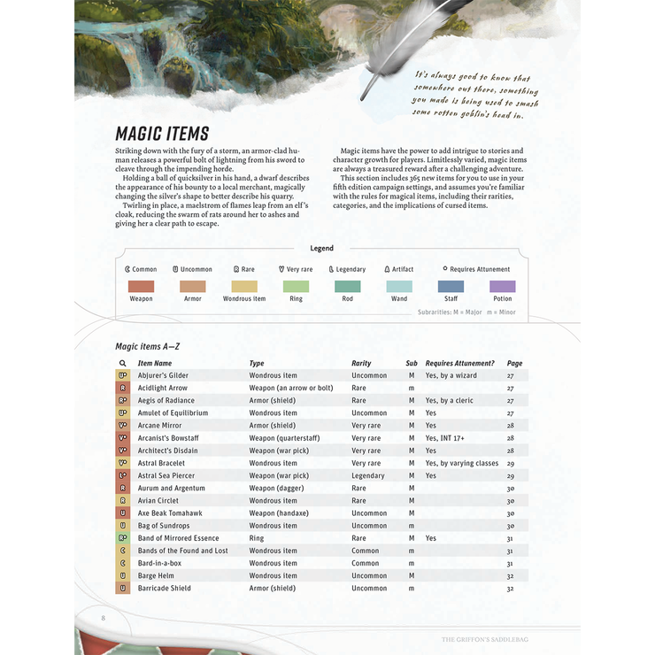 This lushly printed hardcover book is filled with 365 magic items that have been designed, illustrated, and balanced for Fifth Edition by The Griffon's Saddlebag. Fill your campaign with exciting new magical items, such as the dragon tamer's lance or catnip amulet, and reward your players with treasure as unique as their characters. Each item has also been carefully organized into easily searchable charts and random treasure tables. These magical items have been peer-reviewed by thousands of players around the world and strike a charming balance of mechanical intrigue, memorable flavor, and exciting role-playing opportunities.