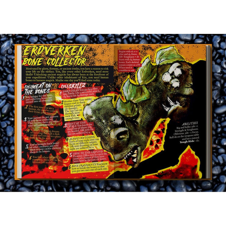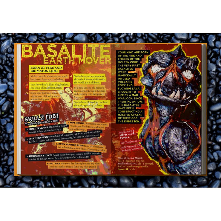 • 8 Fast & Easy Steps to Character Creation — Rolling dice to determine everything about your character sure makes it feel like they will not live long. This includes 8 character classes like the Burnadzi, Basalites, and Greyskrulls. It also has charts for Irritating Idiosyncrasies, Misspent Youth, and Battle Scars to really give your character that extra level of filth.