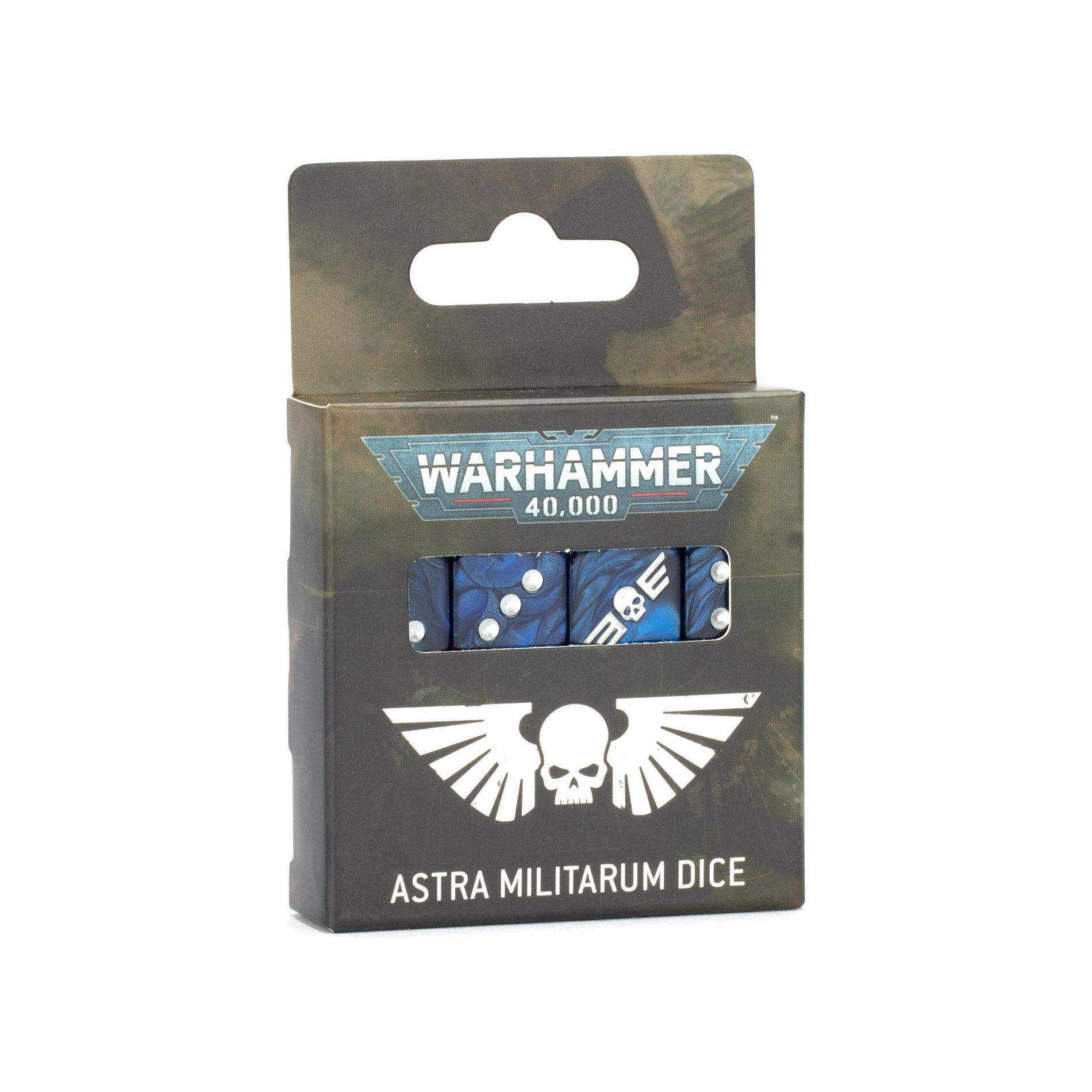 Roll dice in style with a set of 16 square-cornered dice cast in swirled blue plastic with white pips and the Death Korps of Krieg faction icon on the six face.