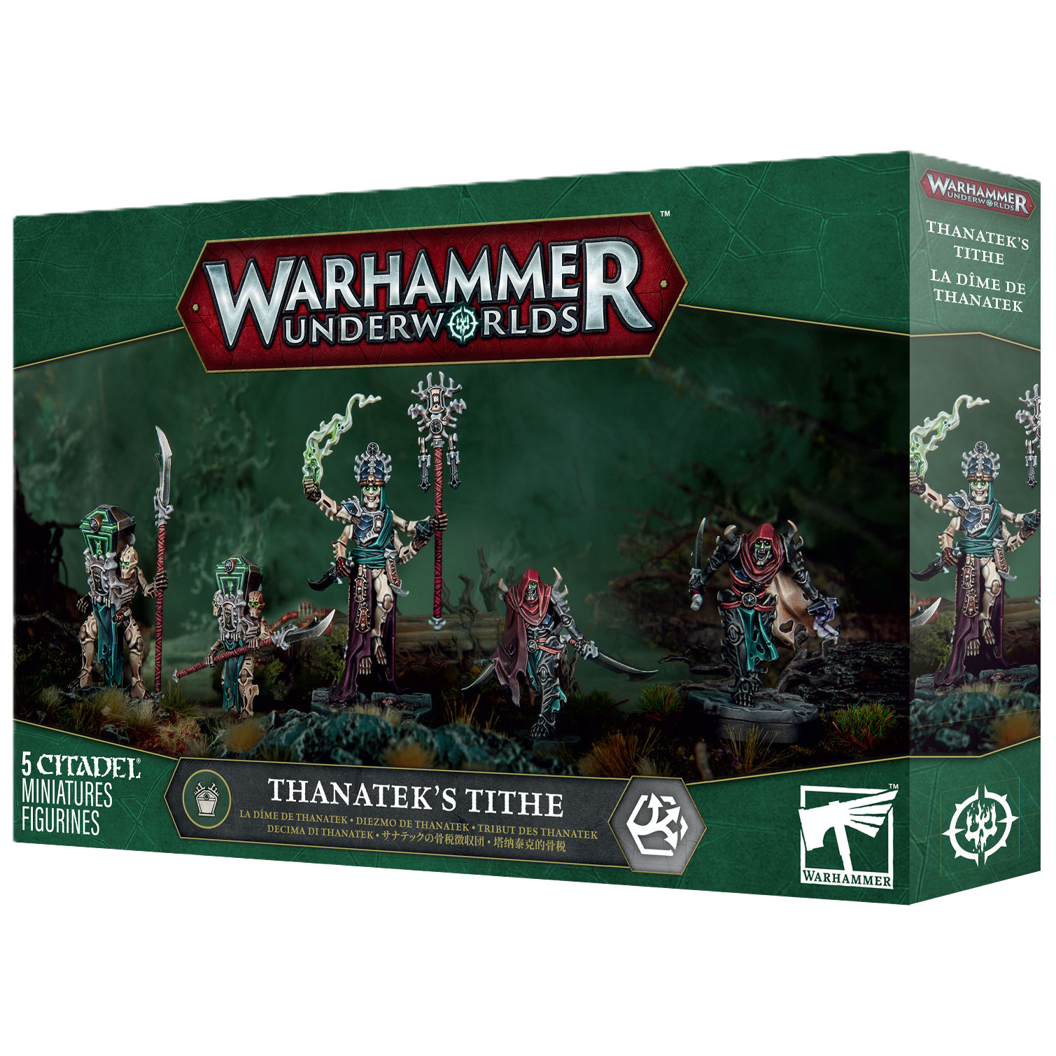 The hidden battlefields below Embergard are not immune to the reach of Nagash and his elite warriors, who are on the hunt for ‘truebone’ – osseous matter imbued with unusual purity – in Warhammer Underworlds. Thanatek’s Tithe is a Flex-style warband of five Ossiarch Bonereapers miniatures, led by the Ossiarch agent Thanatek.