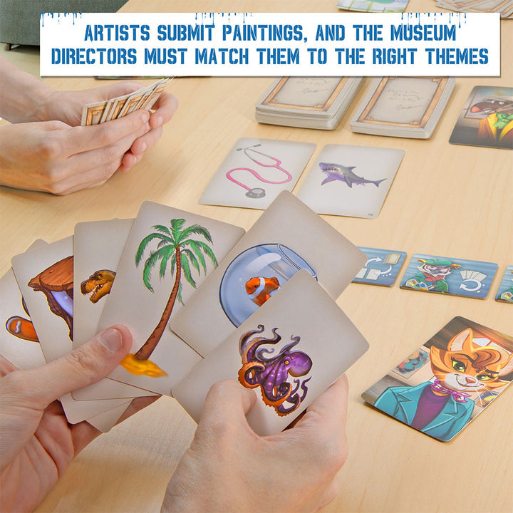 In Belratti, players are split into two roles — buyers and painters — and are playing against the game. The game presents two cards as topics for which the buyers need to buy paintings. They ask for a certain number of cards, and the painters have to collectively meet this target number.