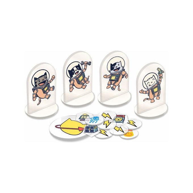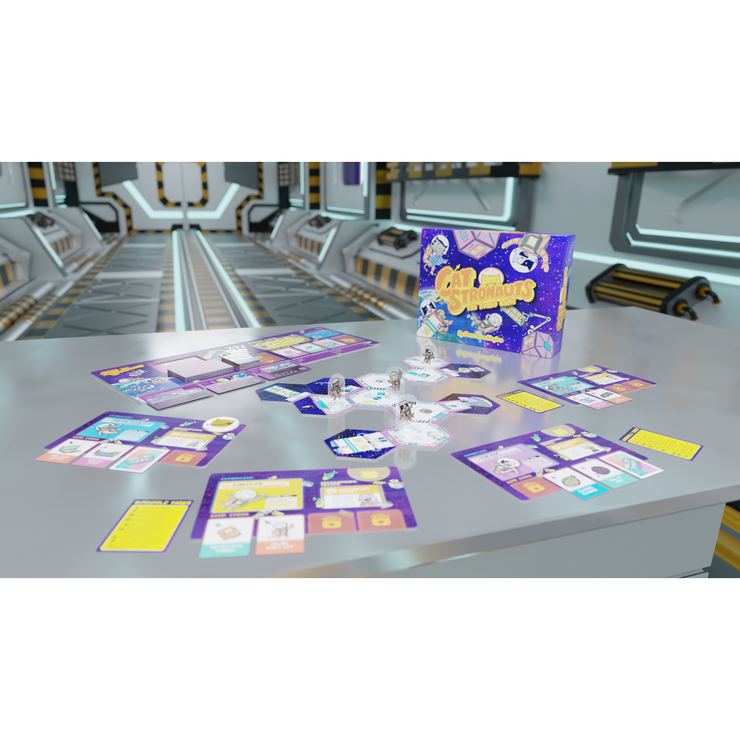 CatStronauts: The Board Game is a co-operative game in which you get to guide fearless commander Major Meowser, brave-but-hungry pilot Waffles, genius technician and inventor Blanket, and quick-thinking science officer Pom Pom on their most important mission yet. You win as a team by completing your core mission, which is to bring all of the space station's new modules online, boot up the system, and launch the re-entry pod before the power level drops to 0. As you move about the space station and assemble the modules as they arrive, you'll encounter side missions and alerts that make your core mission take extra time — but with teamwork and communication, the CatStronauts will overcome these difficulties to make it home in time for their parade. There will be really good snacks, too!