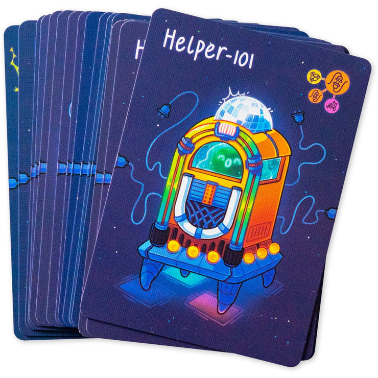 Cosmic Chains offers an unlimited number of ways to create mind-blowing combos and chain reactions, as well as 3 combinable modes for different levels of immersion: symmetrical starting positions (base game), asymmetrical starting positions (Superpowers), and hidden objectives with more ways to earn Victory Points (Space Debris). So, you can customize the game based on your taste or mood. This edition of the game also contains Kickstarter-exclusive components: 6 additional playable cards, 2 holofoil promo teams cards, and a randomly chosen postcard with a comic strip.