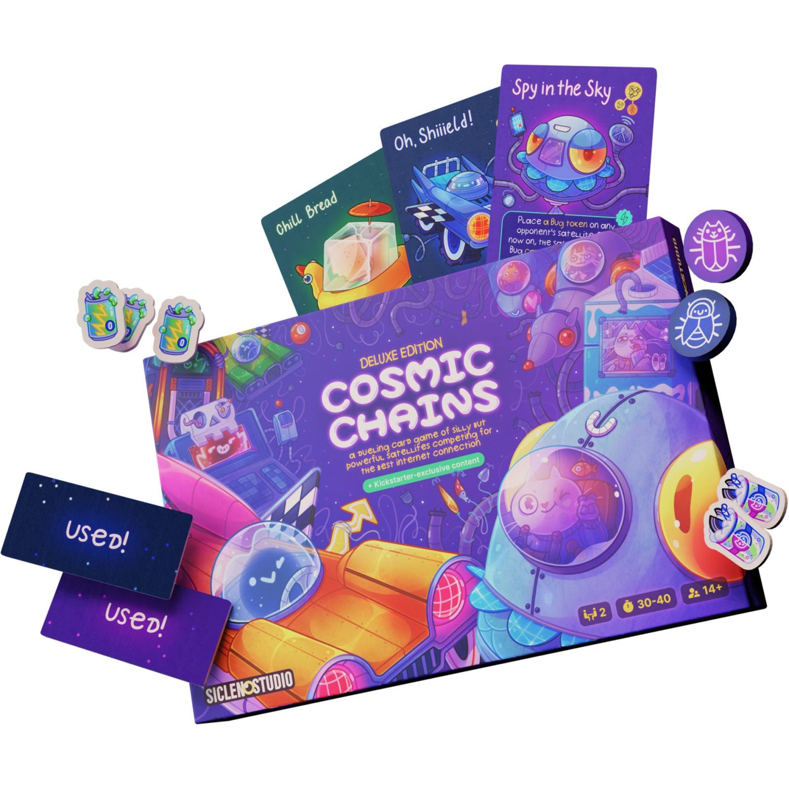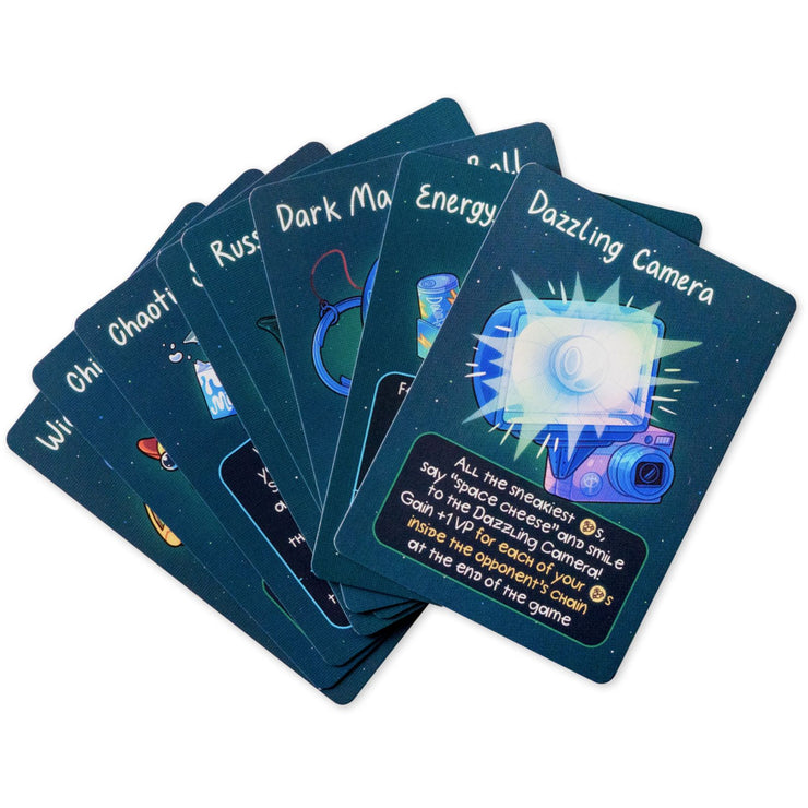 Cosmic Chains is a highly tactical dueling card game of cats and robots competing for the best internet connection on Earth by building the longest satellite chain in space.