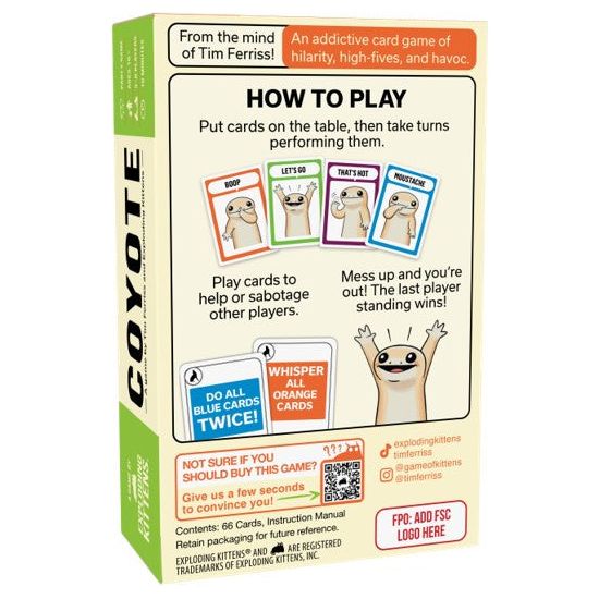 Each card has an action and a word. Lay out a line of cards and take turns, performing and saying each card. Add “coyote” cards to sabotage the other players and make the game harder. Mess up the sequence, and you're out. The last player standing wins! Unleash your trickster spirit with a game that's fast, chaotic, and different every time you play.