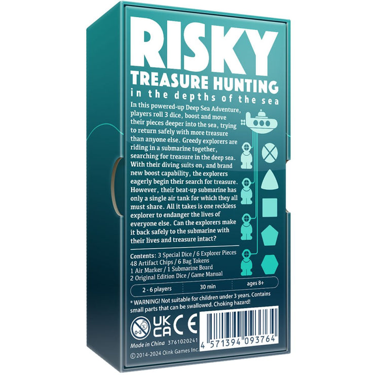 In this powered-up Deep Sea Adventure, players roll 3 dice, boost and move their pieces deeper into the sea, trying to return safely with more treasure than anyone else. Greedy explorers are riding in a submarine together, searching for treasure in the deep sea. With their diving suits on, and brand new boost capability, the explorers eagerly begin their search for treasure. However, their beat-up submarine has only a single air tank for which they all must share. All it takes is one reckless explorer to endanger the lives of everyone else.