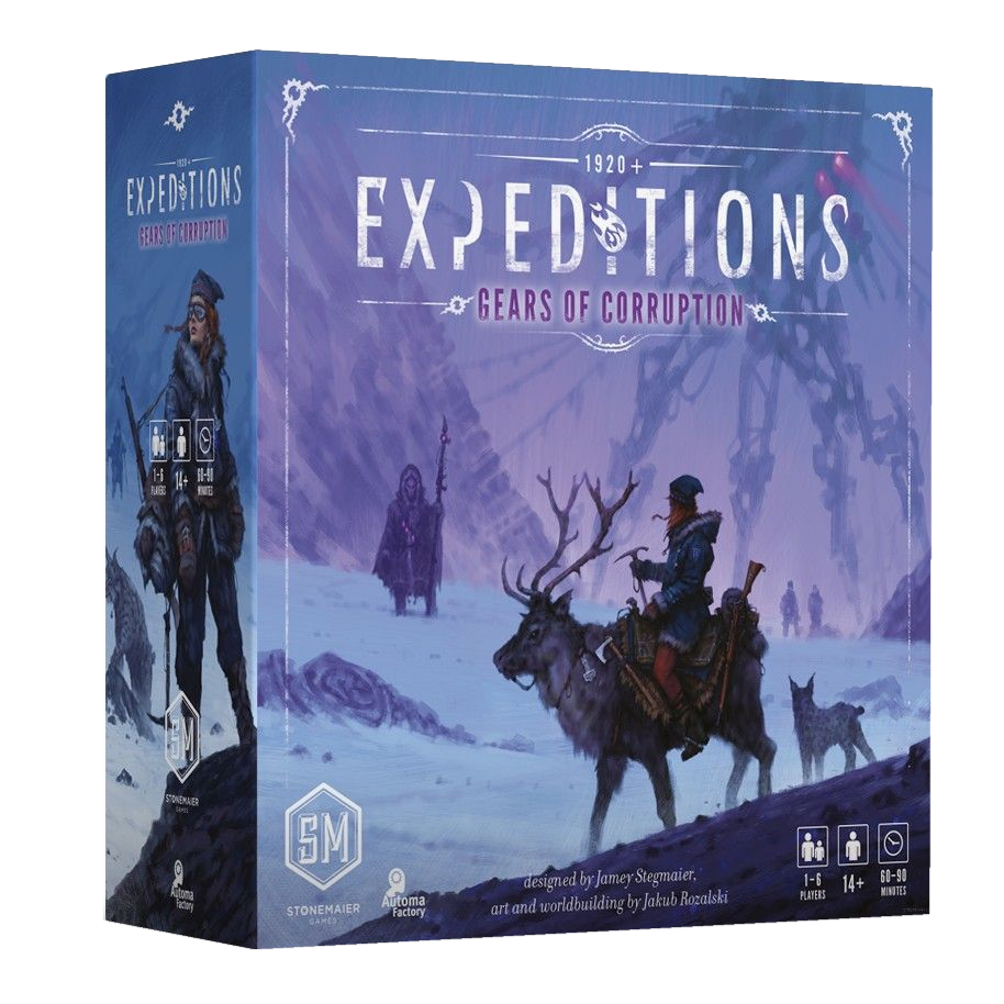 The Gears of Corruption expansion to Expeditions adds elements of risk and danger in the form of secret bonuses on map tokens and a corrupted mech that roams the land. To counter these threats, the expansion offers 2 new mechs and 4 new character/companion pairs, as well as components for a 6th player. Gears of Corruption also accelerates early gameplay by giving players starting resources and a hero worker that can act as any type of worker.