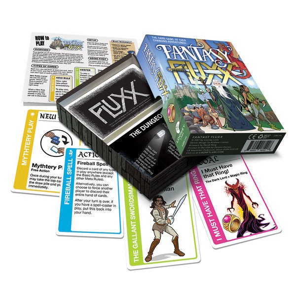 Gather your friends for a party – an adventuring party, that is! Set off on a classic quest with your faithful companions: the Helpful Elf, the Dwarven Warrior, the Gallant Swordsman, and, of course, the Wise Old Wizard. Learn from the Cranky Magic Teacher how to use your Wand to cast spells like Invisibility or Fireball! You may need them as you encounter the Dreaded Pirate, or when you find out that the Captured Princess is actually the Mother of Dragons! Will you and your fantasy favorites survive the Final Showdown with the Dark Lord? Find out when you play Fantasy Fluxx!