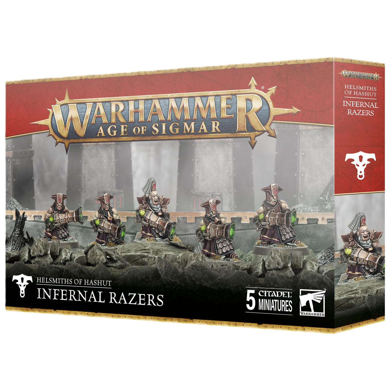 This multipart plastic kit builds five Infernal Razers, infantry wielding heavy firepower for your Helsmiths of Hashut armies in games of Warhammer Age of Sigmar. Heavily armoured and equipped with devastating Grizmalok blunderbusses or light infantry-roasting Karagthrun flamehurlers, they are ready to protect vital objectives and deal death from afar. The kit also includes parts to build an optional champion for your unit of death-dealing warriors.