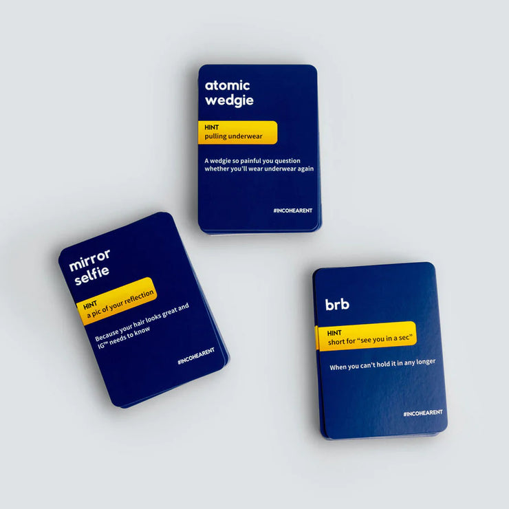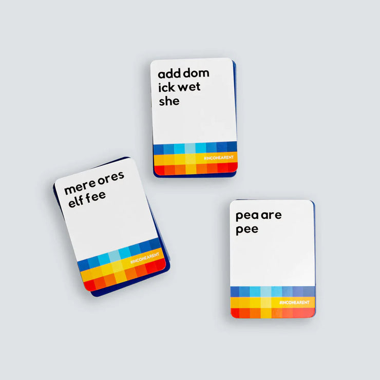 Each card has a combination of words on the front that looks like nonsense, but when recited out loud, they sound like the hidden phrase on the back.