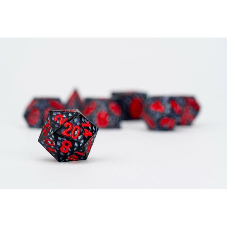 Each full-sized, 16mm resin set comes with 7 dice (d4, d6, d8, d10, d10% (00-90), d12, and d20).