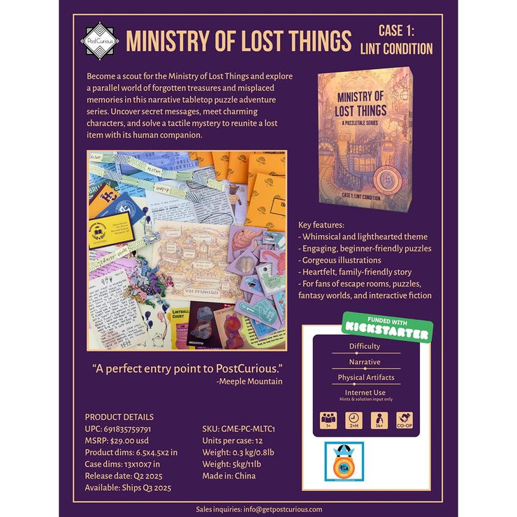 Become a scout for the Ministry of Lost Things! Explore a parallel world of forgotten treasures and misplaced memories in this narrative tabletop puzzle adventure. Uncover secret messages, meet charming characters, and solve a tactile mystery to reunite a lost item with its human companion.