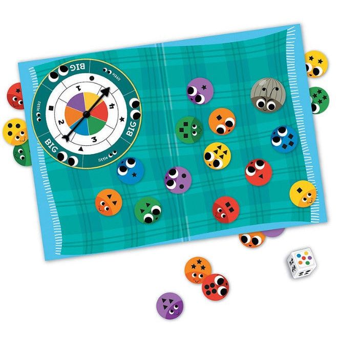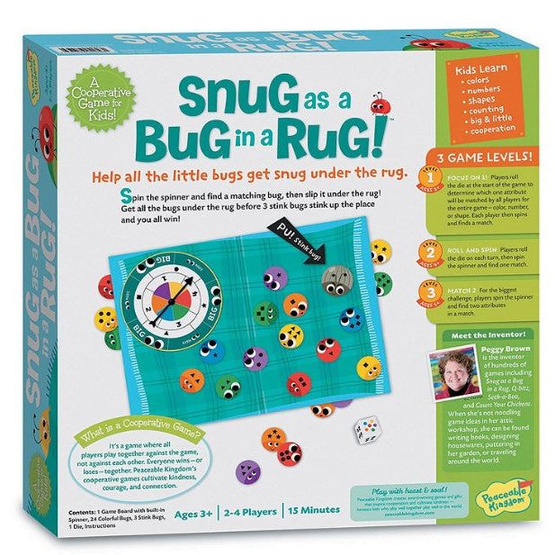 Get all the little colorful bugs under the rug before the 3 stink bugs stink up the place! Watch closely and make those matches! Spin the spinner and find a matching bug. Then slip it under the rug. Take turns spinning and matching and try to get all the bugs under the rug before 3 stink bugs are sitting on top. Each level adds more challenge. Work together to find those matches, and you all win! Unlike most games Snug as a Bug in a Rug encourages kids to work together to keep the stink bugs off the rug.