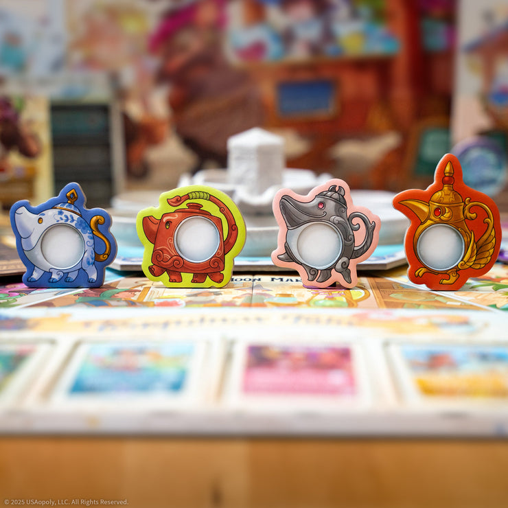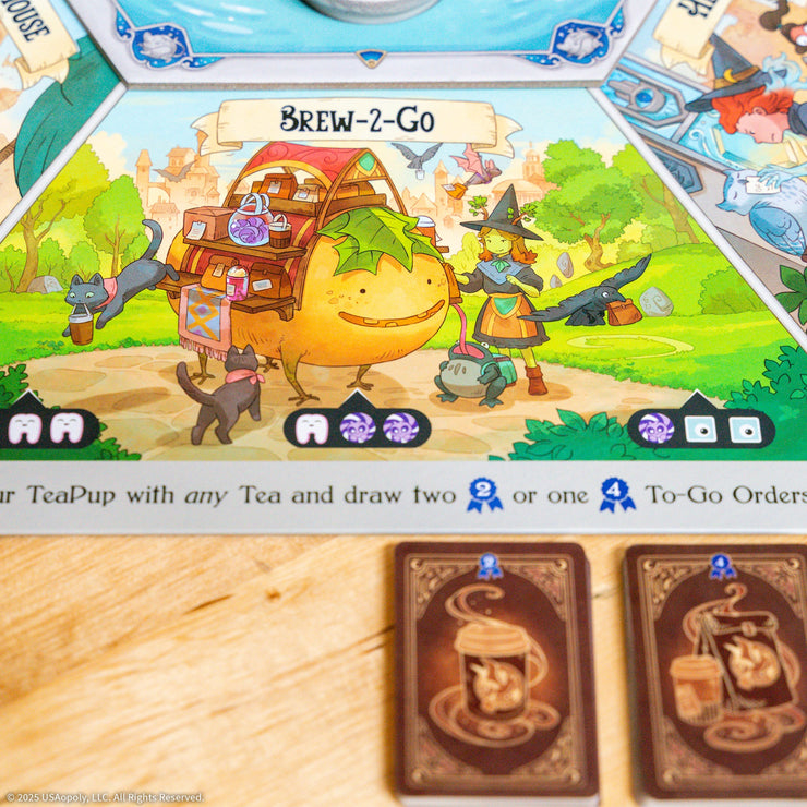 In the service phase, players take turns sending their adorable TeaPups to various Bootiques in the city to gather toppings and collect tea from the rotating crystal fountain in order to serve witches waiting at their hut. Additionally, TeaPups can help players collect powerful upgrades, attract Celebri-teas, and brew up Special-Teas with bonus abilities. Clever TeaPup placement can also help you complete to-go orders for witches out and about in the city center.