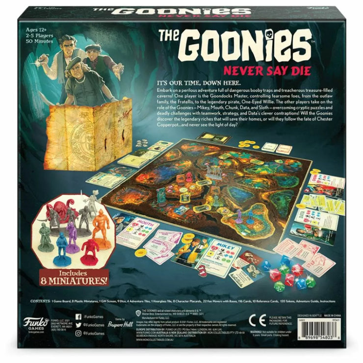 Embark on a perilous adventure full of dangerous booby traps and treacherous treasure-filled caverns! One player is the Goondocks Master, controlling fearsome foes, from the outlaw family, the Fratellis, to the legendary pirate, One-Eyed Willie. The other players take on the role of the Goonies - Mikey, Mouth, Chunk, Data, and Sloth overcoming cryptic puzzles and deadly challenges with teamwork, strategy, and Data's clever contraptions! Will the Goonies discover the legendary riches that will save their homes, or will they follow the fate of Chester Copperpot... and never see the light of day?