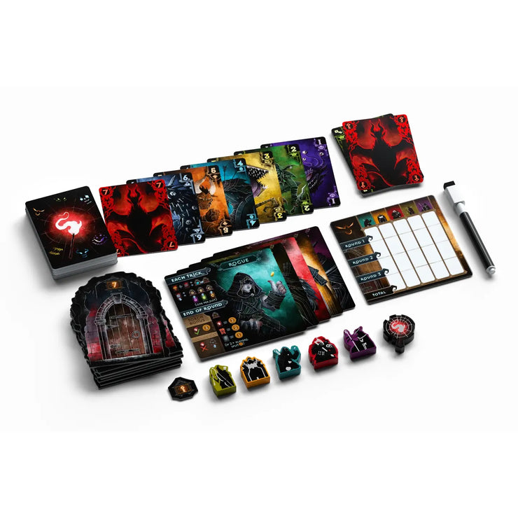 In this trick-taking game, you must decide when to win tricks and when to increase the value of the number of tricks you think you might take. However, points are limited, so if any players end up taking the same amount of tricks, they must divide the points among themselves. After 3 rounds of play, the player with the most points wins!