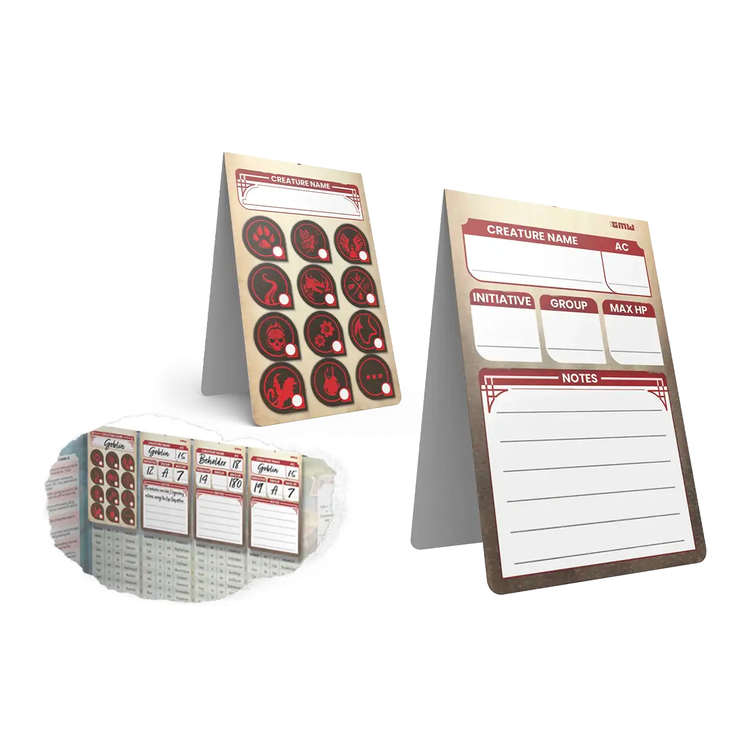 These cards track initiative order. They keep turn order visible while providing space for enemy or player stats and special abilities. They fit neatly over your DM screen. They are reusable with wet-erase markers.