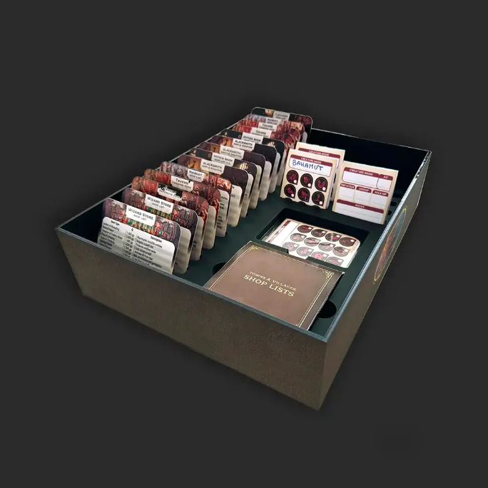 Take notes of what happens in your towns and villages with the Town Ledger, a notebook featuring hand-drawn town and village maps, giving you ready-made locations to drop into your campaign. Fill in details, track town history and keep track of important events or NPCs. The notebook includes a sheet of thematic stickers to mark important places.