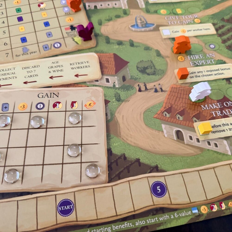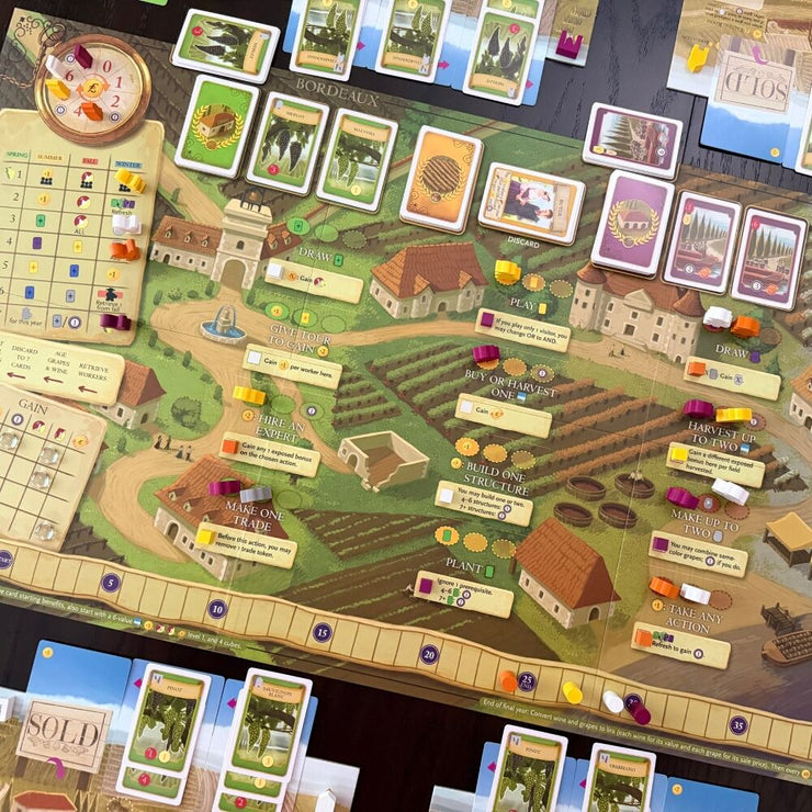 The Bordeaux alternative board expansion to Viticulture offers players a starting boost, 4 full worker placement seasons, a wake-up chart full of benefits, a major new “expert” action that permanently upgrades an action for you, revisions to existing actions, a trade market, face-up cards vine and wine order cards to choose from when drawing, and end-game conversion of grapes, wine, and coins to victory points.